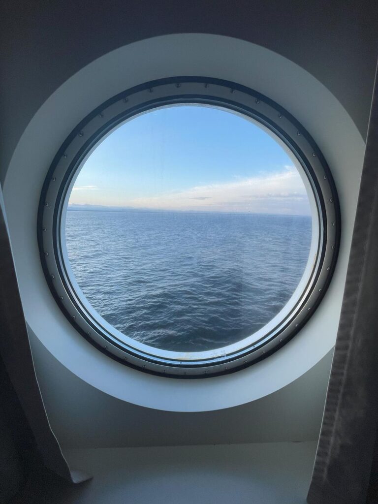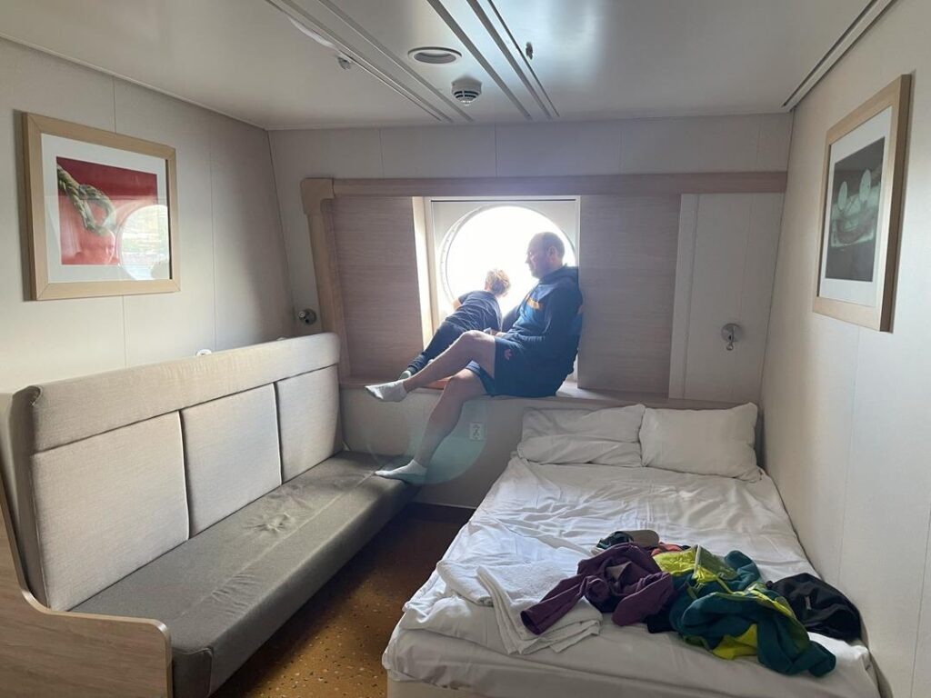 Fjordline, linie które wybraliśmy na rejs do Stavanger, od samego początku okazały się dobrym wyborem. Wszystko było dobrze zorganizowane, zaczynając od check-inu (dla nas to pierwszy raz na promie, więc pojawił się lekki stres) podczas którego obsługa skanuje karty przydzielając kolejkę i dając karty obiadowe/wejściowe do kajuty. Wjazd na poziom 5 odbył się bardzo sprawnie, pozostawiając samochód udaliśmy się na 8 piętro do kajuty. Tam Tv, okno, łazienka i 4 łóżka, jest super. Po zwiedzeniu całego promu czas na odpoczynek, który, ze względu na delikatne bujanie, był bardzo przyjemny.