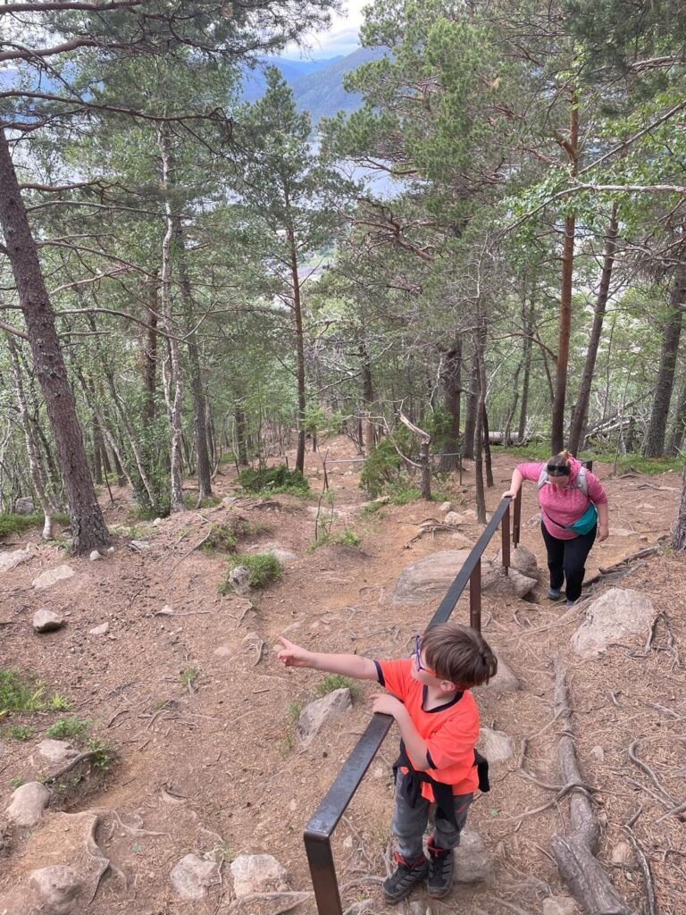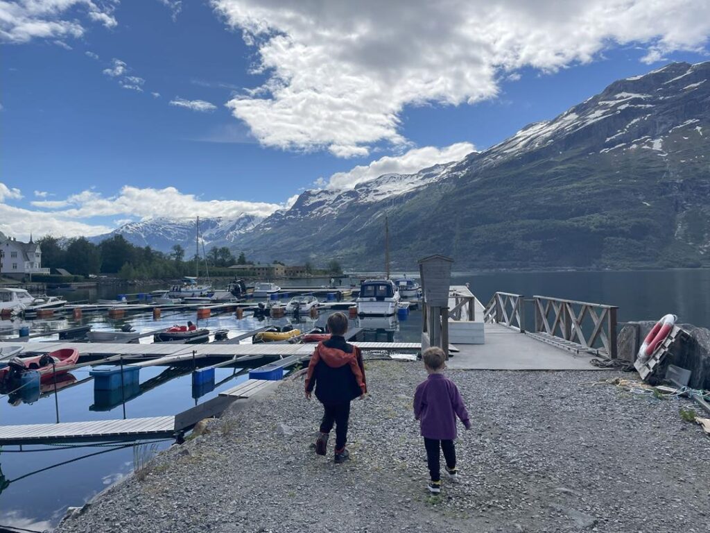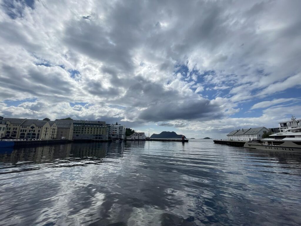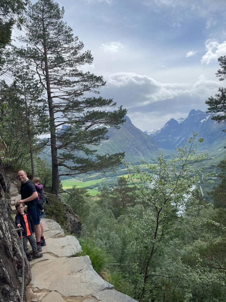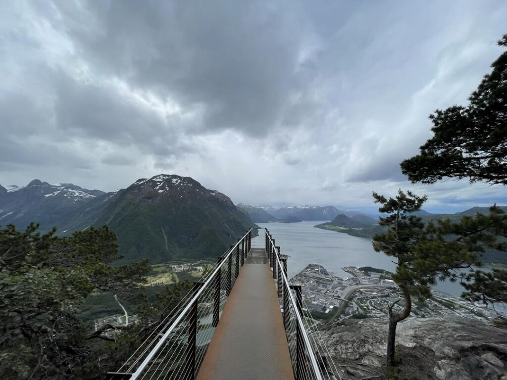 Udajemy się do pobliskiego miasta Andalsnes, które jest najlepszym punktem startowym dla drogi Trollstigen. Ta z powodu osuwisk skalnych niestety nie została otwarta zgodnie z planem na początku czerwca (jak się później okazało zamknięta do końca roku). Naszym wyzwaniem na dzisiaj było podejście niemal 600 m na punkt widokowy Rampestreken. Szlak nie jest trudny lecz wymagający kondycyjnie, ponieważ nieustannie idziemy pod górę przez 2-3h. Kolejny raz nasz dzielmy 6-latek pokonał trasę sam! Młodszy w nosidle na plecach u taty 😉. Widok, który dostarcza zainstalowana nad przepaścią platforma jest spektakularny. Możemy podziwiać całą dolinę Romsdalen, Romsdalsfjorden oraz panoramę miasta. Pokonując dodatkowe, tym razem już bardziej wymagające 100 metrów wzwyż, dochodzimy do stacji kolejki gondolowej. Po ogrzaniu się czas na nagrodę za trudy wspinaczki – jemy pyszne ciasto w restauracji i zjeżdżamy kolejką gondolową w dół. Warto dodać, że pomimo popularności tego miejsca, podczas naszej wędrówki spotykamy zaledwie kilka osób. Ruszamy do Alesund, gdzie na parkingu niedaleko oceanarium spędzamy bardzo wietrzną noc.