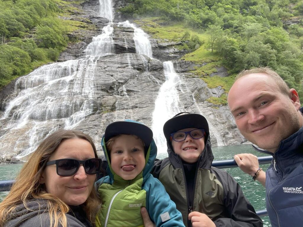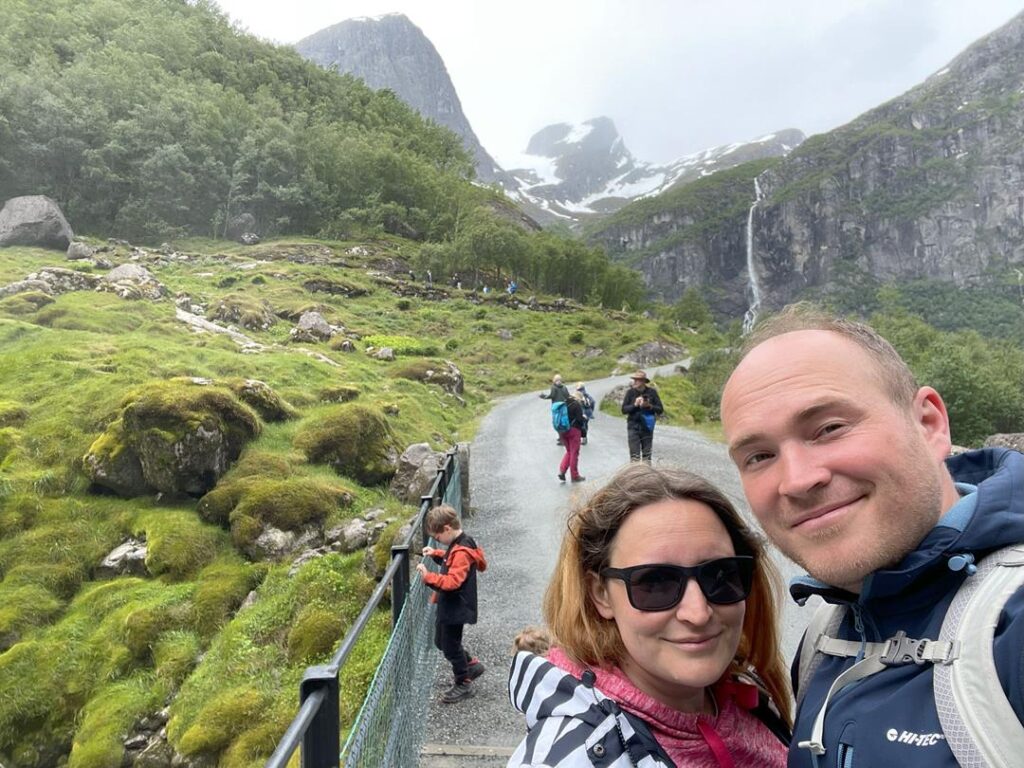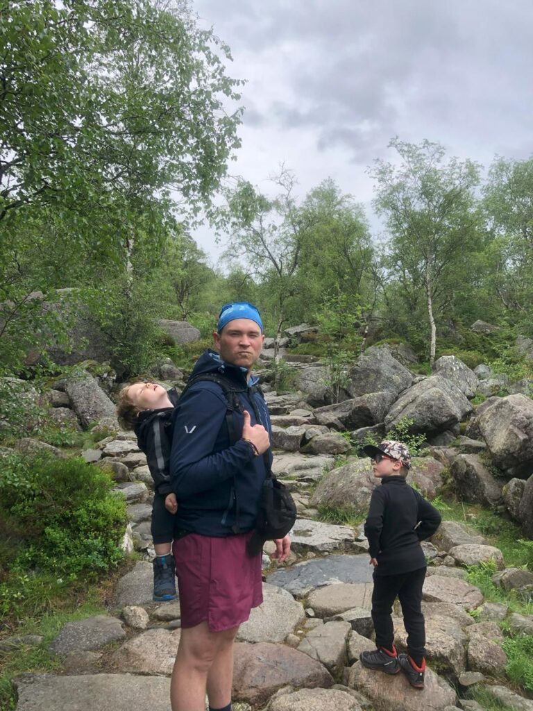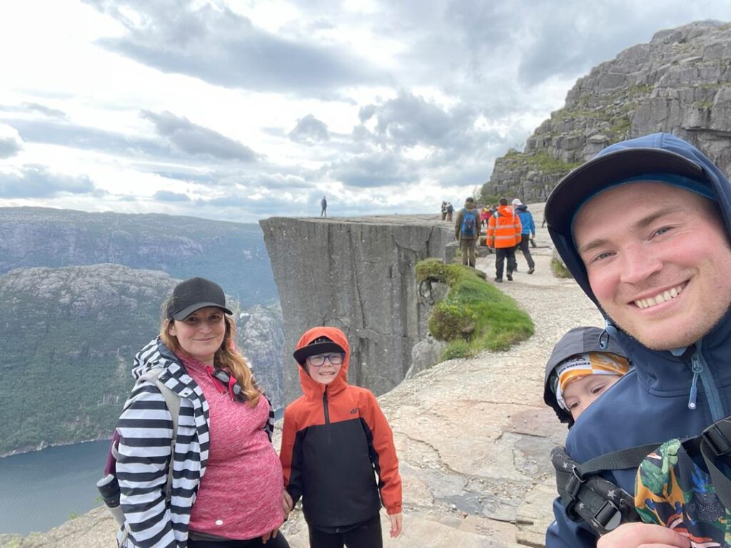 Miły głos z głośników przekazał wszystkim pasażerom informację, że za pół godziny dotrzemy do Stavanger. Dokładnie o 6 rano rozpoczęliśmy naszą przygodę w Norwegii. Nie tracąc ani minuty ruszyliśmy wzdłuż naszego pierwszego fiordu Lysefjord. Kręta droga z pięknymi widokami doprowadziła nas na dobrze zorganizowany parking, skąd zaczyna się szlak do jednego z najbardziej znanych miejsc w Norwegii – Preikestolen. Informacje i szczegóły trasy polecam sprawdzić na stronie https://preikestolen365.com/ . 4 kilometrowy, przygotowany przez nepalskich szerpów szlak dostarcza niesamowitych widoków. Można go pokonać dość szybko, jednak my nieśpiesznie delektowaliśmy się widokami i małymi przystankami. Szlak jest dość prosty (nasz 6 latek pokonał go bez żadnej pomocy), natomiast momentami jest dość stromo, więc wymaga pewnej kondycji i co najważniejsze odpowiedniego ubrania. Pogoda zmieniała się co chwilę. Gdy dotarliśmy na sam klif, niektóre porywy wiatru były tak silne, że niebezpiecznym było stać obok przepaści. Udało się jednak wejść i poczuć niesamowitą adrenalinę, wolność i ogromną przestrzeń, która dostarcza spektakularnych widoków. Po powrocie tym samym szlakiem kierujemy się na Ryfylke National Tourist Route. Piękna trasa między fiordami oraz niemal zerowy ruch na trasie. Korzystając niezmiennie z Park4night wybieramy jeden z wielu parkingów przy trasie z pełnym węzłem sanitarnym za symboliczne 100 NOK-ów. Dodam tylko, że jesteśmy nad samym jeziorem, a w okolicy są dwa wodospady, taki standard 😉
