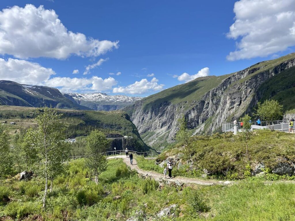 Zaczynamy dzień od odwiedzin jednej z wielu urokliwych miejscowości, do której przybijają kilkupiętrowe wycieczkowce – Eidfjord. Korzystając z pobliskiego COPP-a uzupełniamy zapasy i udajemy się do położonego niedaleko Voringfossen. U podnóża Hotelu Fossli rozpościera się wspaniały widok na cały kanion wraz z wodospadami. Dzięki rozległym platformom widokowym, z których część jest wysunięta ponad granicę kanionu, możemy podziwiać widoki z wielu perspektyw. Kolejnym przystankiem było Norsk Natursenter Hardanger w miejscowości Ovre Eidfjord. W ciągu dwóch godzin możemy poznać historię pobliskiego parku krajobrazowego. Muzeum jest bardzo nowoczesne i ekspozycja interesująca dla dużych i małych. Nam, szczególnie podobał się 25 minutowy film wyświetlany w sali kinowej ukazujący największe walory tutejszej przyrody. Kontynuując jazdę ’13-tką’ wybieramy kolejny raz parking pod wodospadem na nocny obóz