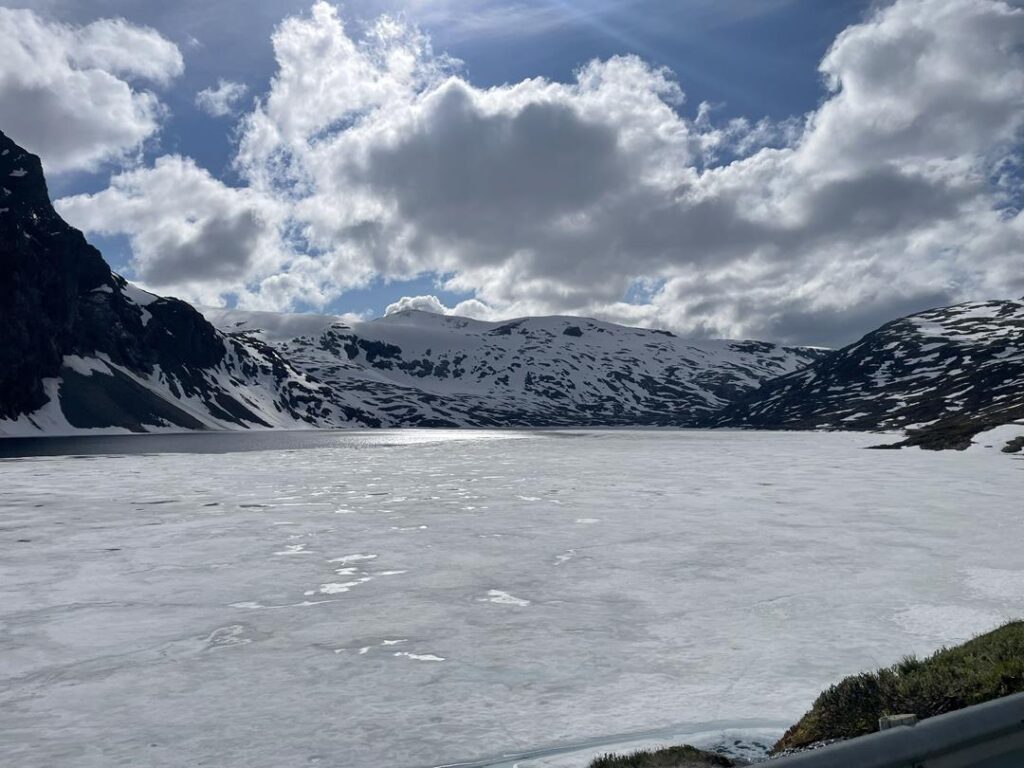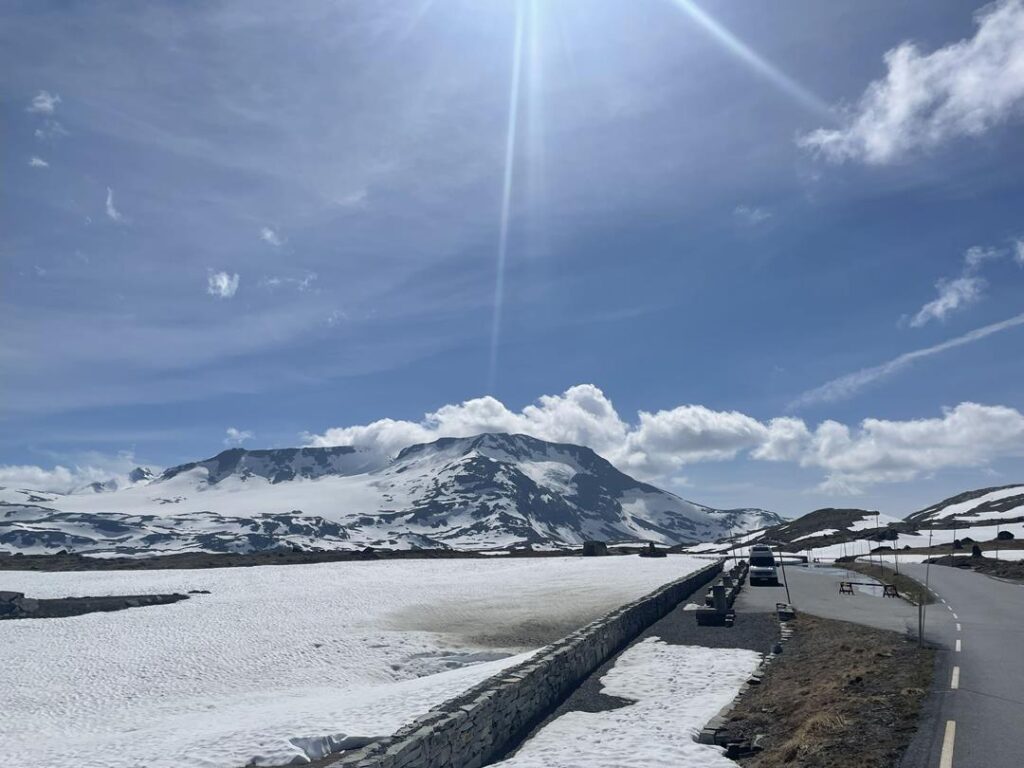 Sognefjellet to najwyżej położona trasa w Norwegii. Niezliczona liczba serpentyn prowadzi nas w iście księżycowy klimat. To właśnie stąd pochodzą słynne zdjęcia dróg z kilku metrowymi zaspami śniegu po obu stronach. Przemierzając ogromną polodowcową dolinę dostajemy się w samo serce gór Jotunheimen, gdzie na wyciągnięcie ręki mamy najwyższe, ośnieżone szczyty kraju z Galdhopiggen na czele. Podczas 108 km trasy warto zatrzymać się na dłużej przy jednym z punktów widokowych i wybrać się na trekking. Nam najbardziej przypadł do gustu punkt widokowy o nazwie Nedre Oscarshaug, gdzie specjalna instalacja pozwala zlokalizować podpisane szczyty. Stopniowo zjeżdżając w dół pejzaż zmienia się w zielone zbocza gór odbijające się w jeziorach. W ten sposób dostajemy się do miasta Lom, gdzie śpimy na parkingu w towarzystwie XIII wiecznego kościoła Stavkirke.