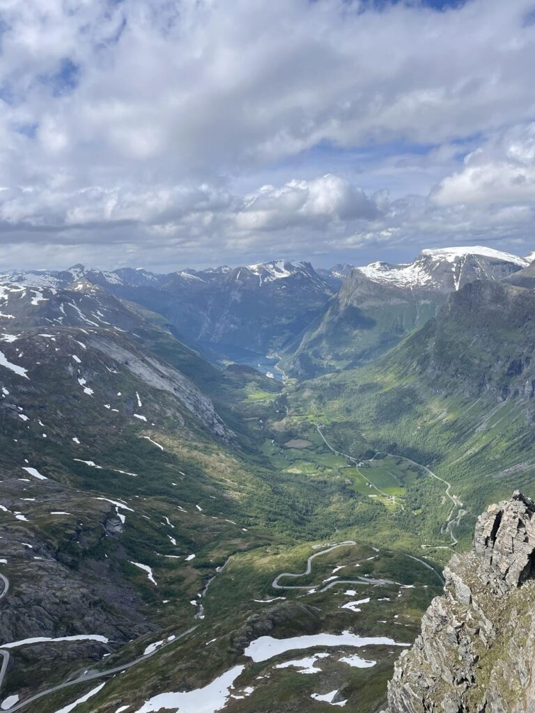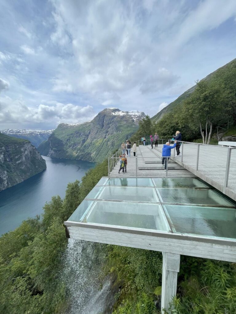 Część Trollstigen nadal pozostaje zamknięta, więc wjeżdżamy na tą wyjątkową trasę zaczynając od Eidsdal. Piękne widoki towarzyszą nam praktycznie przez rzez cały czas. Można również odczuć, że jest to jedna z najsłynniejszych i najbardziej popularnych dróg Norwegii – parkingi przy punktach widokowych są pełne. Jeden z nich był szczególny, Ornesvingen. Szklana platforma dostarcza wspaniałych widoków na najbardziej znany fiord Geirangerfjorden, warto pójść na krótki, niezbyt wymagający spacer scieżką ponad platformą, by móc podziwiać fiord w samotności. Pokonując kolejne serpentyny dojeżdżamy do malowniczego miasteczka Geiranger. Początkowo kierujemy się do Norsk Fjordsenter, gdzie specjalnie przygotowana wioska górska przybliża nam dzieje lokalnej społeczności oraz sposoby budowy górskich dróg. Imitacje lawin oraz osuwisk pokazują niebezpieczeństwo, które niesie za sobą położenie miasteczka. Warto również przejść pobliską platformą w dół do wodospadu. Ze względu na całkowity zakaz camperowania na dziko, polecam zatrzymać się na campingu w samym centrum przy marinie. Widok jest niesamowity. Inaczej też spędza się czas w tej miejscowości po obejrzeniu filmu „Fala” w którym fale tsunami, spowodowane osuwiskiem, zalały całą dolinę 😉