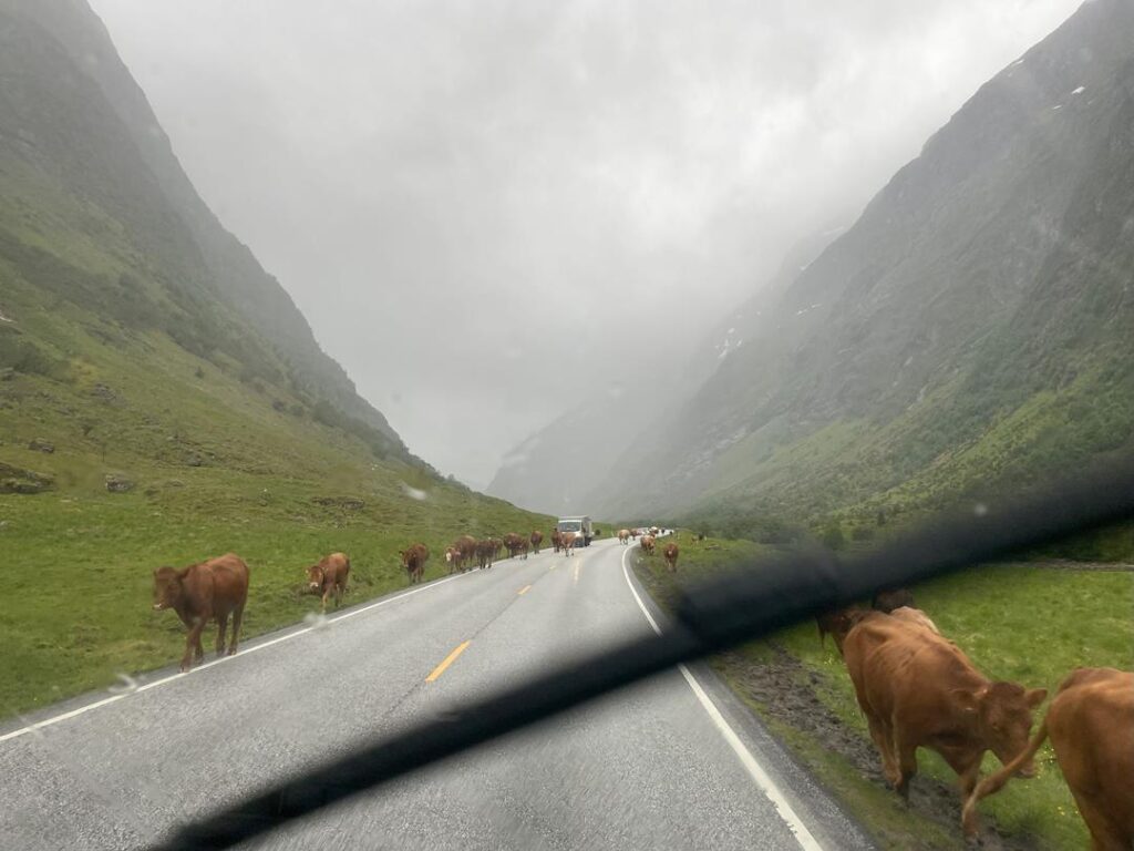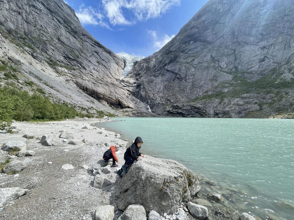 Trzykilometrowy szlak zaczyna się przy hotelu Briksdalsbre Fjellstove. Już na początku możemy podziwiać wodospad Kleivafossen. Malownicza trasa, otoczona szczytami gór, prowadzi nas pod jęzor lodowca Briksdalsbreen. W połączeniu z turkusowym jeziorem daje spektakularny widok. W pewnym momencie usłyszeliśmy hałas odbijający się po całej dolinie, głośniejszy od uderzeń pioruna. To były pęknięcia lodowca, które spowodowały lawinę na jęzorze. Sytuacja wywołała niemałą konsternację wśród nas i małej grupy turystów znajdującej się obok. Natura, dała o sobie znać : ). Na dość krótkim i łatwym szlaku spędziliśmy niemal pół dnia. Krystalicznie czysta woda prosto z lodowca (smakuje wyśmienicie), dobra pogoda, trasa wiodąca wzdłuż rzeki i ciekawe masywy skalne dały nam dużo zabawy z dziećmi. Czas jechać dalej, tym razem przez ostatnią już na naszej trasie trasę krajobrazową, która wita nas stadami krów blokującymi drogę. Obfite opady deszczu towarzyszyły nam do pierwszego punktu widokowego na trasie, gdzie spędziliśmy spokojną noc.