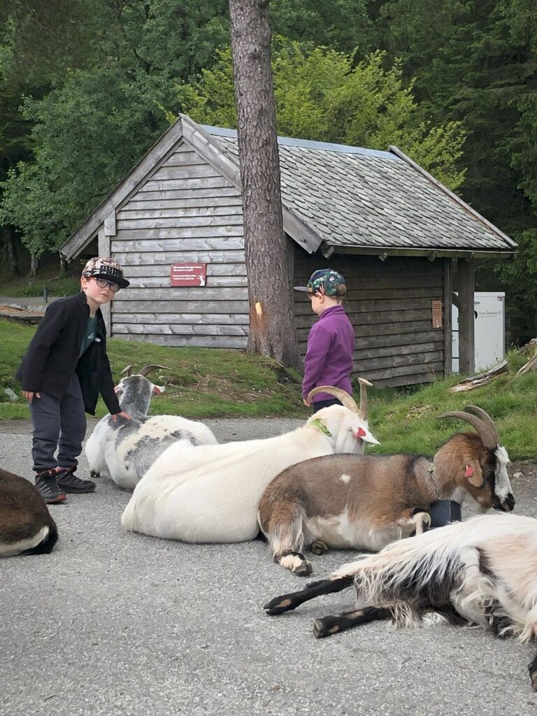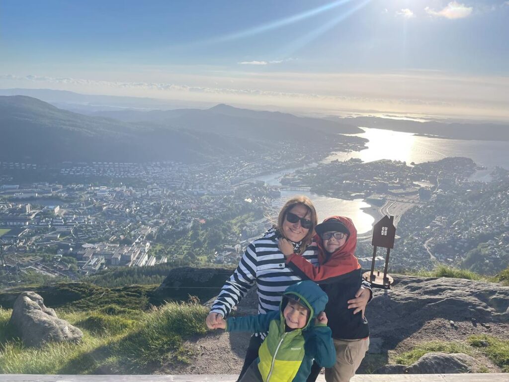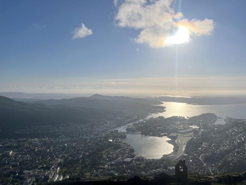 Kolejny słoneczny dzień w Bergen, zaczynamy od największego muzeum w mieście University Museum. Miejsce oferuje niezliczoną ilość eksponatów związanych z tajemnicami wód, historią i powstawaniem wielu zjawisk geologicznych. Odbywają się również ciekawe wystawy, my trafiliśmy na te dotyczące sztucznej inteligencji i przemijania czasu. Dzieciom szczególnie podobały się piętra z kolekcją wypchanych zwierząt z całego świata. To były dobrze spędzone trzy godziny. Kilkaset metrów dalej udajemy się do kolejnego muzeum Sjofartsmuseum. Prezentowana kolekcja dotyczy historii norweskiej żeglugi, która została przedstawiona na wielu pieczołowicie wykonanych modelach statków. Kolejną część dnia spędziliśmy na zwiedzaniu nadbrzeżnego centrum miasta, gdzie możemy podziwiać urokliwe wąskie uliczki z kolorowymi domami. Korzystając tramwaju wodnego udajemy się na zwykłym bilecie komunikacji miejskiej na drugą stronę zatoki do Kravik. Po 30 minutach decydujemy się na rejs powrotny dający doskonałe widoki na Bergen z poziomu wody. Ostatnim punktem była kolejka linowa na wzgórze Ulriken (643 m n.p.m.). Przejazd jest dość drogi, natomiast widoki warte są tej ceny. Nieco oddalony od miasta szczyt pozwala ujrzeć rozległą panoramę całej zatoki. Mamy godzinę 22 i słońce, które oświetla miasto w spektakularny sposób. Powoli kończymy nasz ostatni dzień w Norwegii, gdybyśmy mieli więcej czasu, na pewno skorzystalibyśmy z niezliczonej ilości tras trekkingowych, które oferują wzgórza otaczające Bergen.
