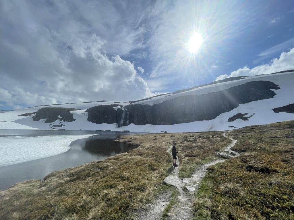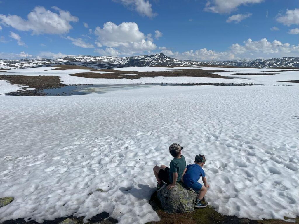 Kontynuując naszą podróż na północ, do miejscowości Laerdal można dojechać nowym ponad 30 km tunelem. Jest jeszcze trasa alternatywna, o wiele ciekawsza. Mamy szczęście, bo zaledwie kilka dni wcześniej została otwarta dla ruchu tzw. „Droga śnieżna” Aurlandsfjellet. Trasa od samego początku dostarcza wielu mocnych wrażeń zaczynając od podjazdu na spektakularny punkt widokowy Stegastein, który jest wychylony ponad fiord i zakończony szklaną barierą. Wjeżdżając w wysokie góry, które niemal przez cały rok pokryte są śniegiem, ma się wrażenie opuszczonego, nietkniętego przez człowieka miejsca. Zbliżająca się pora obiadu zastała nas przy punkcie widokowym Flotane. Bezchmurne niebo, 17C ciepła, brak innych turystów, wędrówka do pobliskiego, pokrytego śniegiem wodospadu na długo pozostanie w naszej pamięci. 47 kilometrową, krętą trasę można przejechać w 2h, tylko po co 🙂 . Po 6 godzinach zjeżdżamy do miasta Laerdal na darmowy parking z placem zabaw dla dzieci i plażą z pięknym widokiem na fiord.