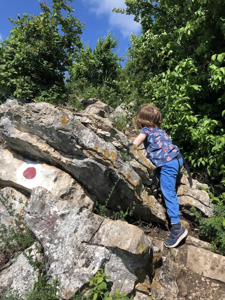 Trasa przyjemnie pnie się w górę, trochę lasem, trochę odkrytymi zboczami. Miejscowo zwykła leśna ścieżka z ubitej ziemi, w innych miejscach wspinaczka po kamieniach. Ale taka przyjemna – że Igi ma frajdę i sam daje radę, my też nieco zmęczeni (Julek śpi w nosidle), ale bardzo pozytywnie. Po drodze na górę i na jej szczycie nie spotykamy nikogo poza stadem owiec i kilkoma jaszczurkami. Wejście zajęło nam niecałą godzinę, za to widok na górze boski, pięknie, wysoko, strzeliste skały i panorama ciągnąca się kilometrami – to zdecydowanie najwyższy punkt w okolicy. I żadnego turysty… żadnego. Można poczuć jedność z naturą i się wyciszyć.