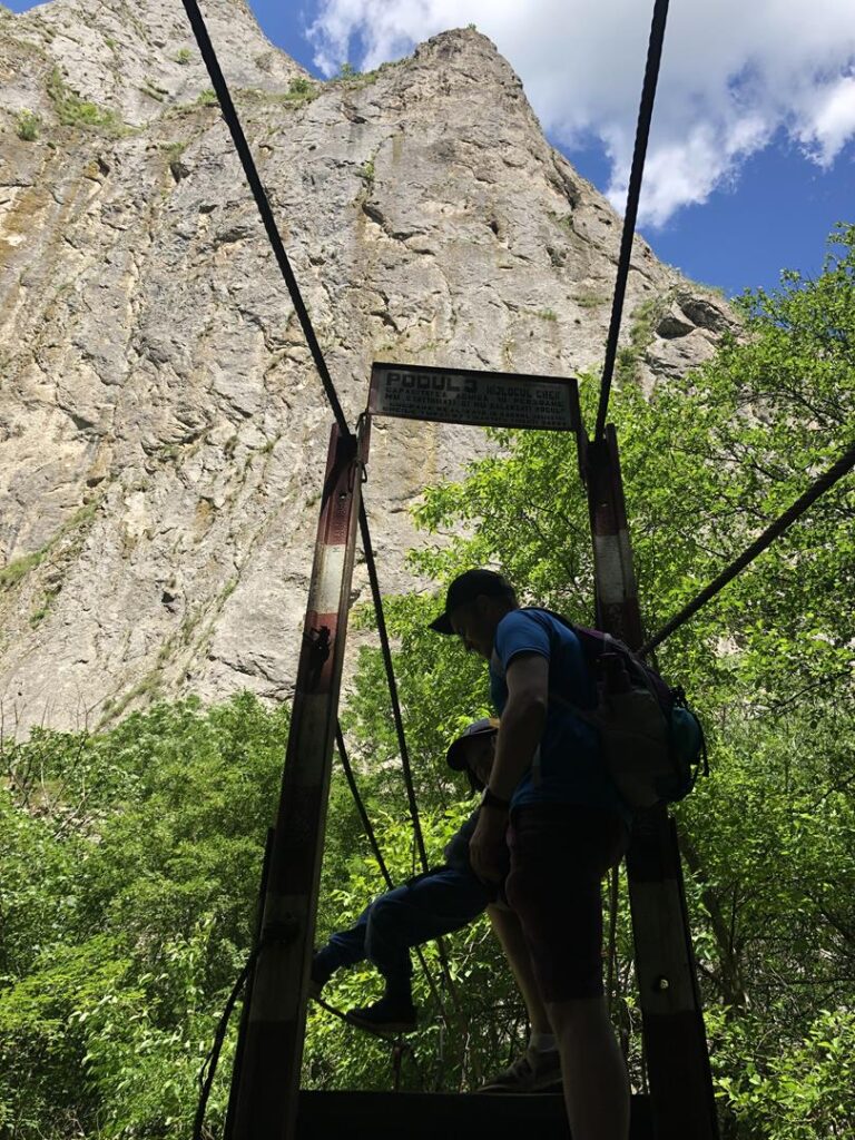 Pierwszy dzień prawdziwych wakacji – kiedy nigdzie nie musimy się spieszyć. Góry, a w zasadzie wąwóz – Cheile Turzii – spogląda na nas odkąd przyjechaliśmy wczoraj na camping. Wiedzieliśmy, że chcemy przejść pomiędzy dwoma masywami skalnymi, ale dla całości obrazu postanowiliśmy wejść na górę. Szybkie śniadanie – jajecznica z kiełbaską, plecak wypchany przekąskami i pieluchami i w drogę. Pogoda od rana zachwyca, przed 10 ruszamy na szlak, choć ciężko na niego trafić – jest mapka, są jakieś strzałki, ale gubią się między malutkimi pensjonatami i budkami z langosami… Jakiś człowiek pokazuje nam wąski prześwit w lesie pomiędzy domkami i na migi pokazuje, że tamtędy wejdziemy na górę. Nie wygląda to obiecująco, ale idziemy. Pierwsze oznaczenie szlaku znajdujemy po dobrych kilkudziesięciu metrach… pokonanych w górę. Ale rzeczywiście – jesteśmy na szlaku z czerwoną kropeczką.