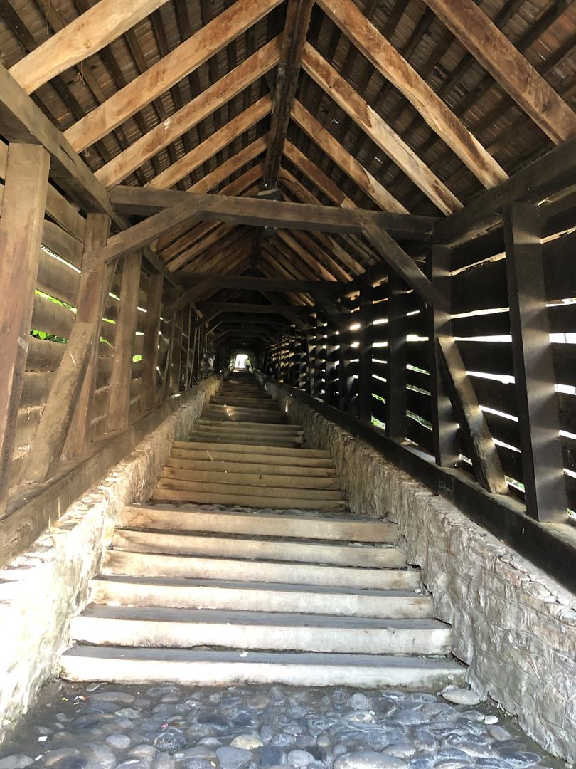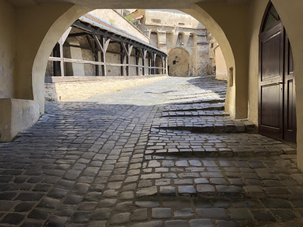 Ruszyliśmy do Sighisoary – mieliśmy upatrzony parking i stanęliśmy blisko centrum – 12 RON za dobę, także bardzo przyzwoicie. Miasteczko klimatycznie – średniowieczna zabudowa, która częściowo przetrwała, piękna wieża zegarowa, i dom, w którym żył Vlad Palovnik. Przyjemnie się chodziło między małymi kamieniczkami, w każdej uliczce można było odnaleźć coś ciekawego. Kościół na wzgórzu – w najwyższym punkcie cytadeli a prowadzą do niego schody – drewniane, wzmacniane kamieniem, pokryte dachem, który robi niesamowity klimat – znów na usta się ciśnie Harry Potter – tych schodów nie powstydziliby się w Hogwarcie. Sam kościół – niewielki, dość surowy, ale warty przespacerowania się po wspomnianych schodach. Przy okazji nasz ekwipunek powiększył się o tarczę i miecz, a my zjedliśmy pyszne, niedrogie langosze (12 RON za sztukę).