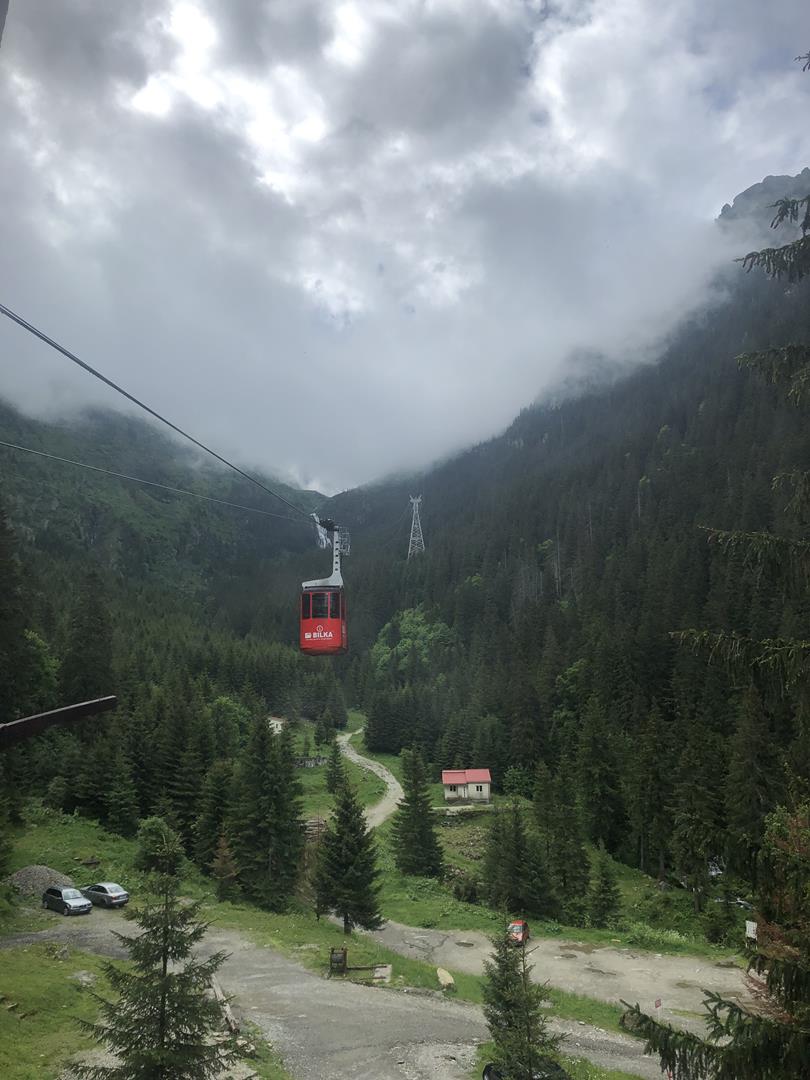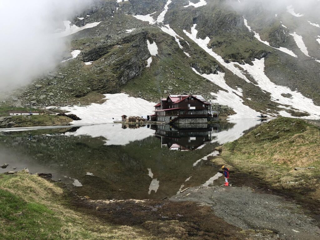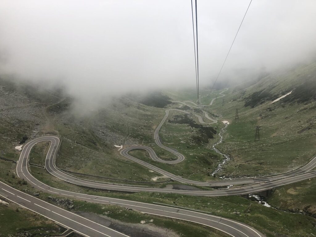 Sam parking jest w miarę pusty (dotarliśmy tu ok. 9:30) i świetnie położony – gwarantuje piękny widok na wodospad Balea, na otaczające szczyty górskie i na tym tle wyróżniają się małe czerwone wagoniki telecabiny. Weszliśmy do budynku, z którego rusza kolejka, gdzie miły pan powiedział ,by odjechać potrzebujemy min. 8 osób. Na szczęście czekaliśmy 5 minut i grupa się zebrała. Wycieczka na górę to koszt 40 RON za dorosłego, 20 RON za dziecko, taki sam koszt będzie nas czekał przy powrocie na dół. Sama kolejka jest malutka i na pewno lata świetności ma za sobą, ale to tylko dodaje jej uroku. Dość szybko zmierzamy ku górze. Trasa ma 4 km i ponad 800 metrów przewyższenia – także jest dość stromo. Z okien widzimy wodospad Balea, pokonujemy kolejne odcinki trasy i już gdy spodziewamy się zobaczyć piękne serpentyny trasy, nadchodzi taka mgła, że absolutnie nic nie widać 😉